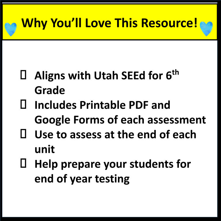 Utah SEEd 6th Grade Assessments combines the Assessments for Strands 6.1, 6.2, 6.3, and 6.4 of the Utah SEEd. The assessments can be used after each strand is taught or at the end of the year for review and practice. The format is multiple-choice and short-answer. All assessments have answer keys. This includes Google Forms and printable PDFs.