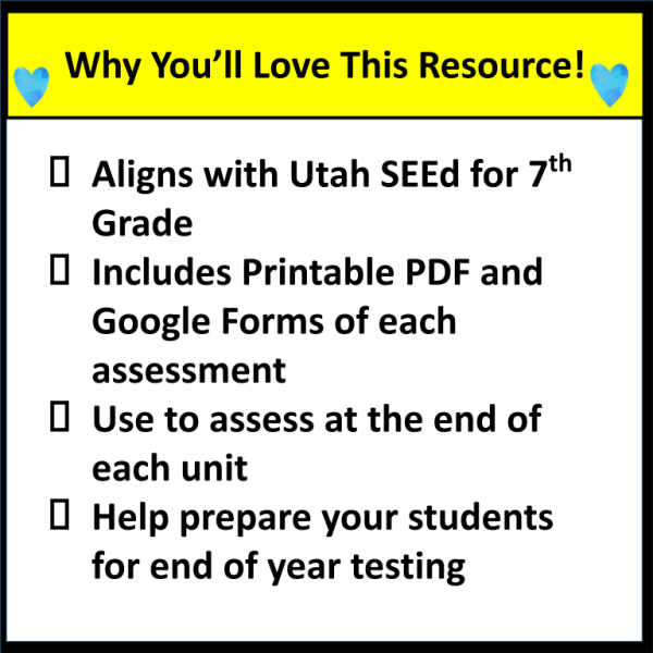 This Utah SEEd 7th Grade Assessment Includes Printable and Google Form Assessments for all the 7th Grade standards in the Utah SEEd. These quizzes include multiple-choice and short-answer questions with answer keys. Help prepare your students for the end-of-year RISE testing or use it as an end-of-unit assessment.