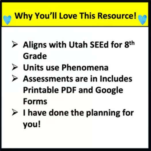 This Bundle for Utah SEEd 8th grade includes science resources for each strand and standard. Each unit included addresses specific Utah SEEd standards for 8th-grade science. Students will love these engaging activities for Utah SEEd 8th Grade. You will love saving time by having someone create resources who understands Utah SEEd! This bundle will keep your students engaged in science for the entire year. Save 20% by purchasing the bundle!