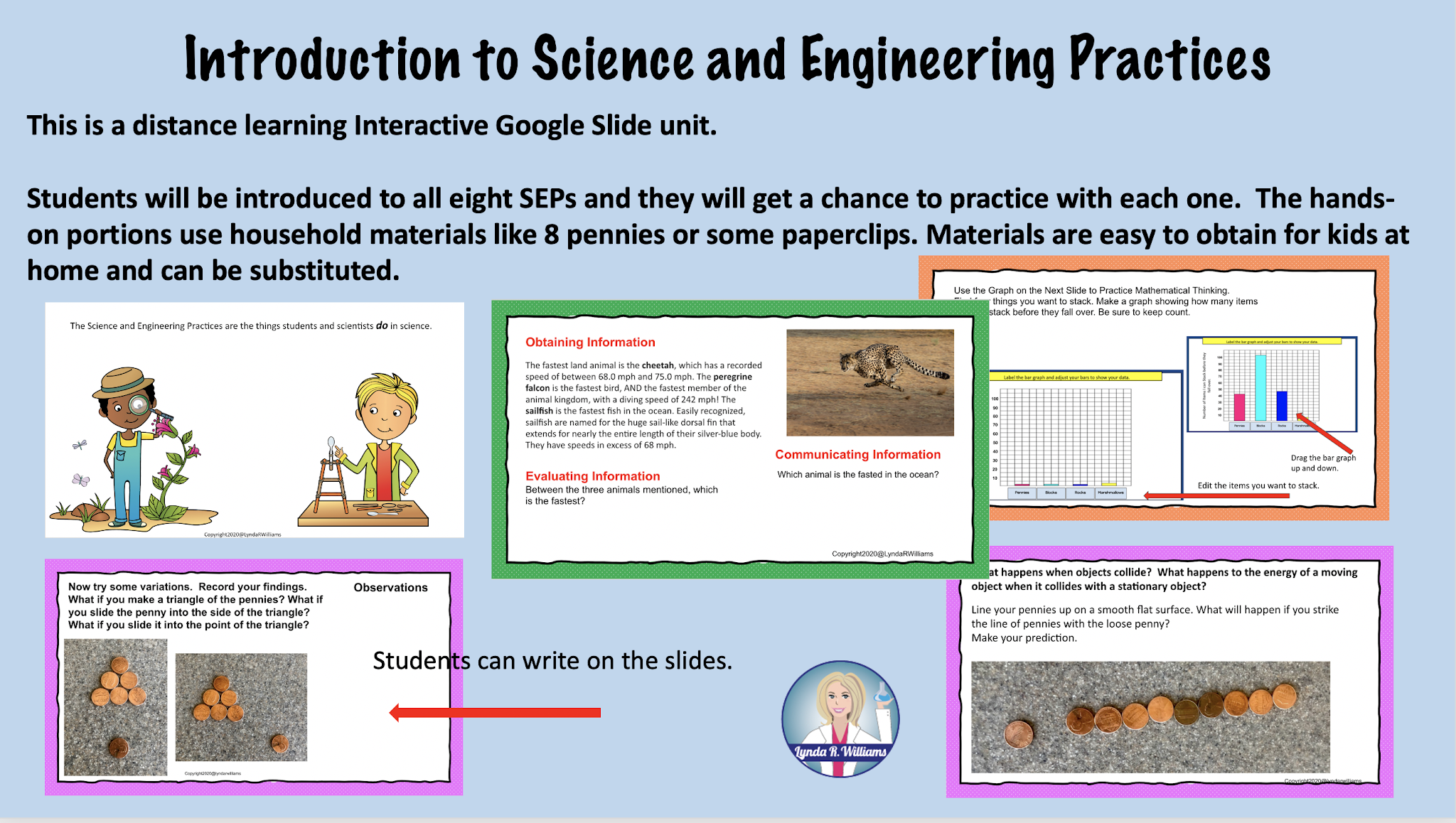 Are you looking for an engaging activity to introduce and review the science and engineering practices with upper elementary students? Look no further. This online unit is self-directed and designed for distance learning. Students will be introduced to each Science and Engineering Practice and then they will have a chance to practice each one with interactive Google Slides, videos, drag and drop activities, and even hands-on activities using simple household materials. No prep for teacher…just share in Google Classroom.