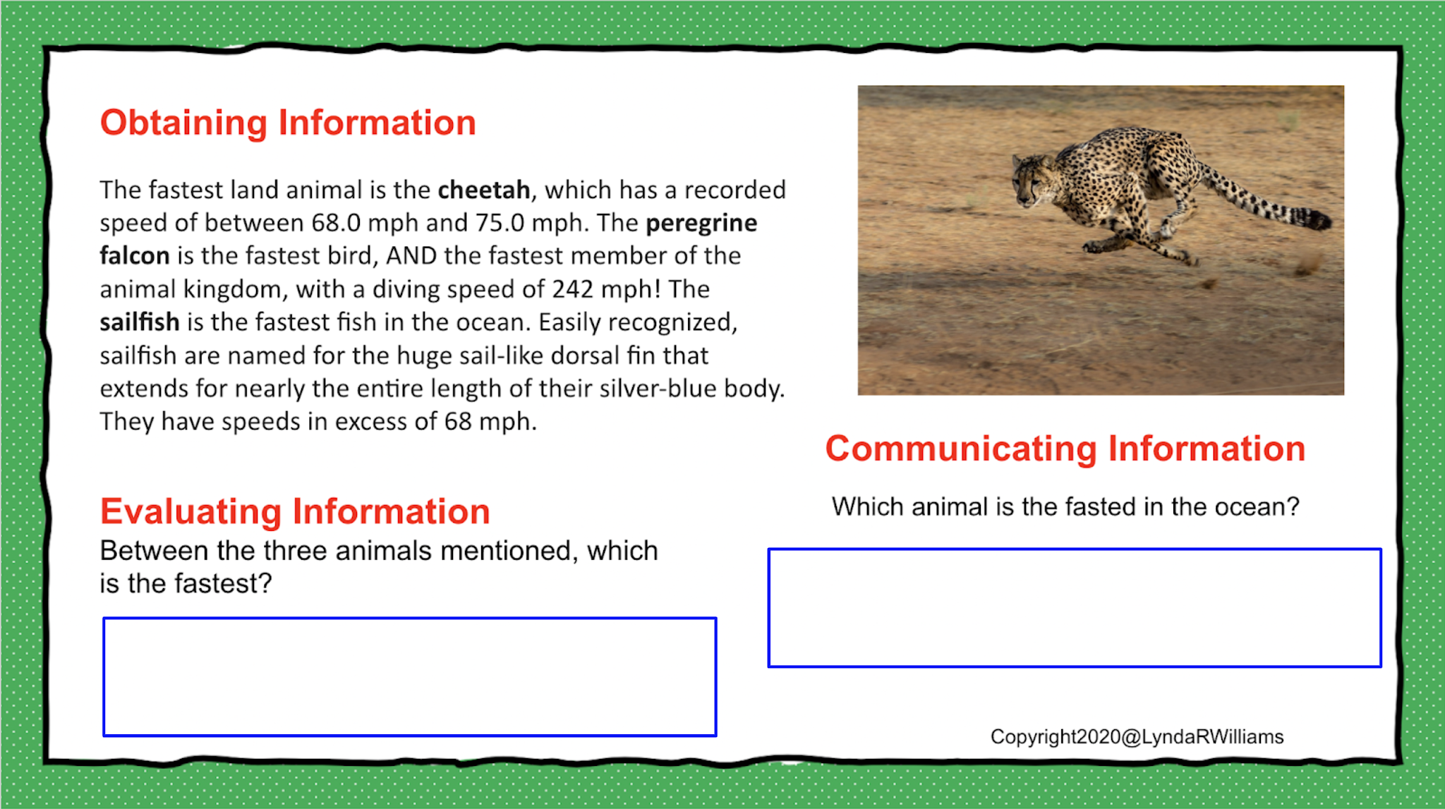 8. Obtaining, evaluating, and communicating information: Students obtain, evaluate, and communicate information as well as derive meaning from scientific information or presented evidence using appropriate scientific language. They communicate their findings clearly and persuasively in a variety of ways including written text, graphs, diagrams, charts, tables, or orally.