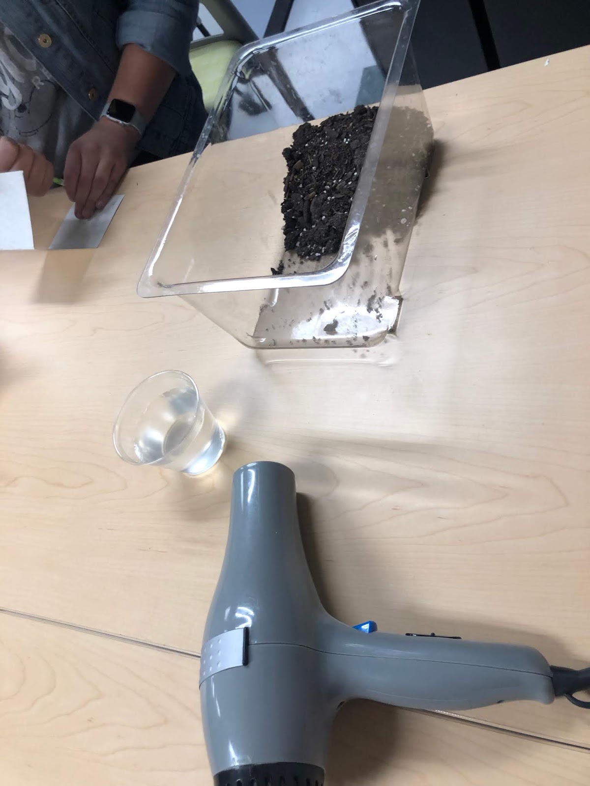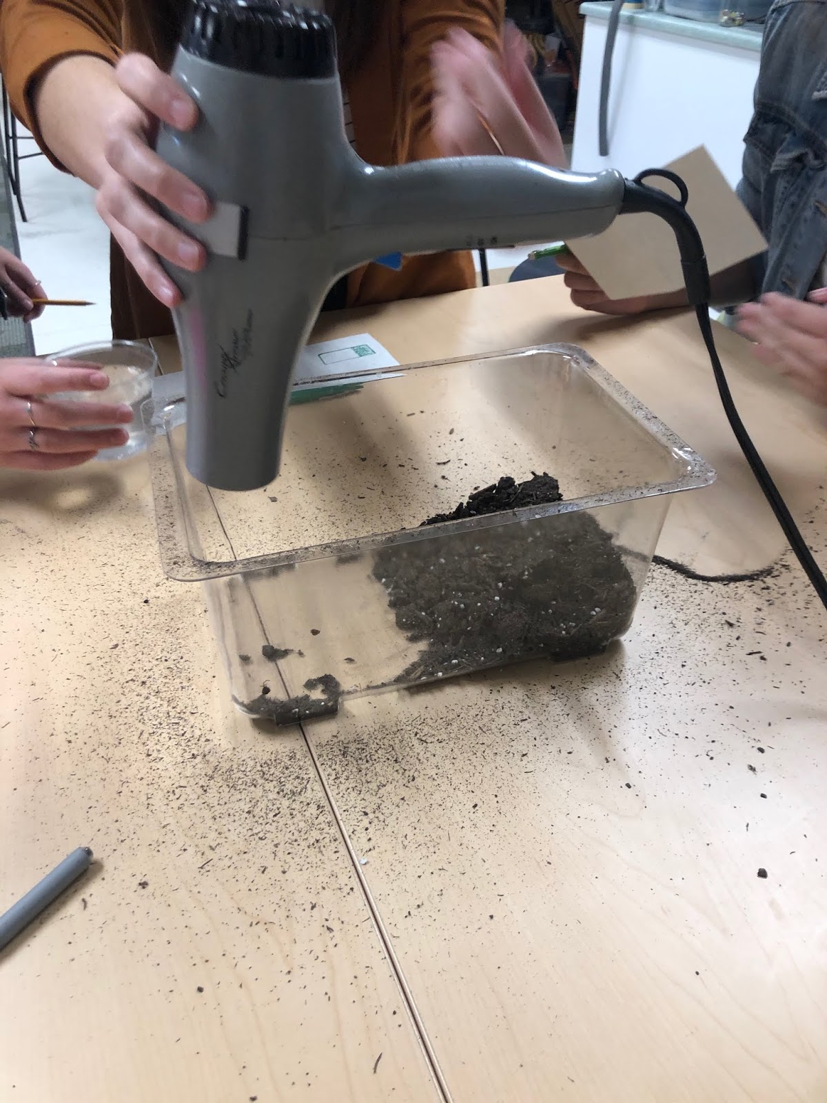 Then students are given soil in a tub, a blow dryer, and a cup of water. How can air and water change the land?