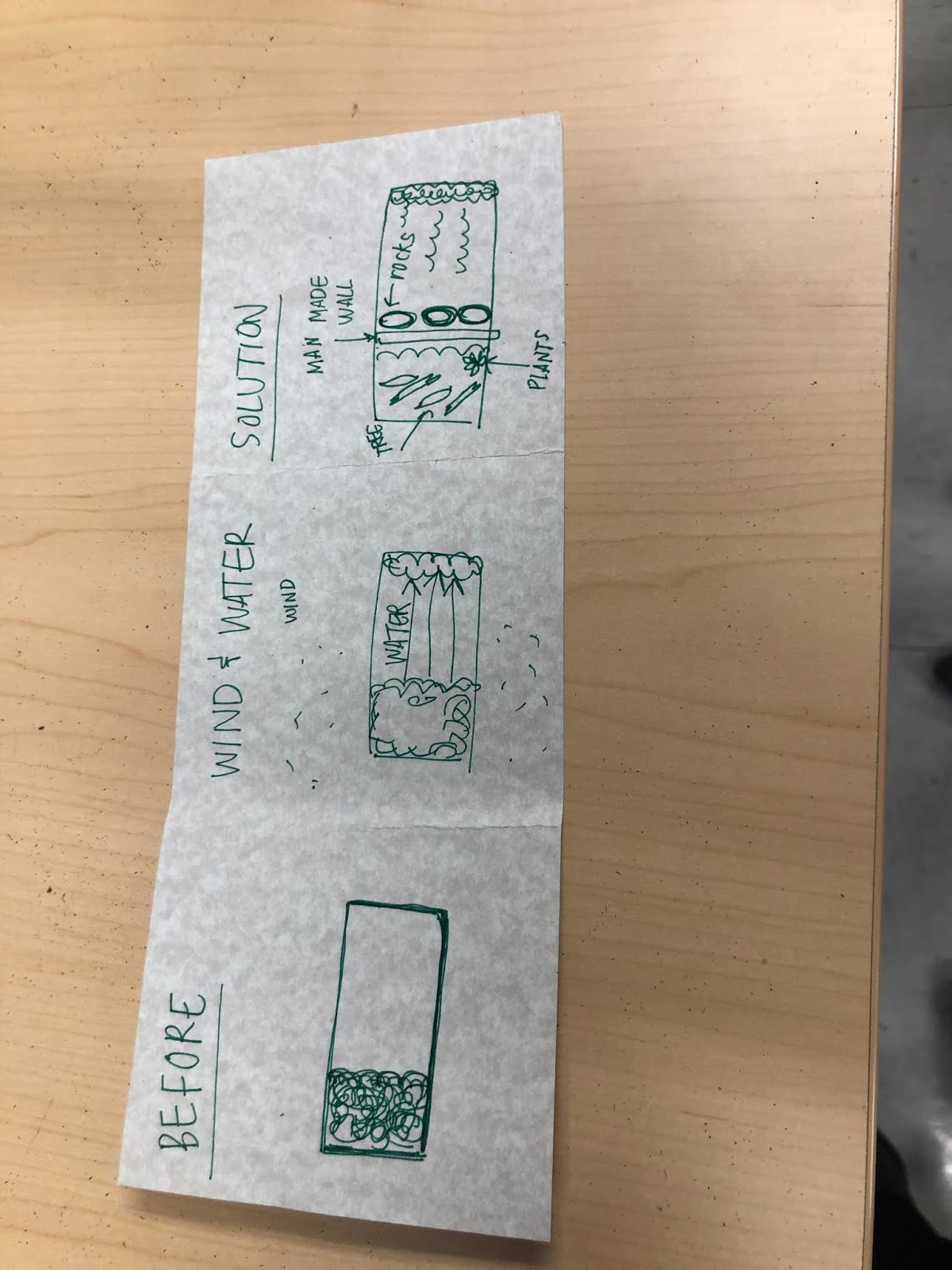 Standard 2.1.3 Design solutions to slow or prevent wind or water from changing the shape of land. Define the problem by asking questions and gathering information, convey designs through sketches, drawings, or physical models, and compare and test designs. Examples of solutions could include retaining walls, dikes, windbreaks, shrubs, trees, and grass to hold back wind, water, and land.