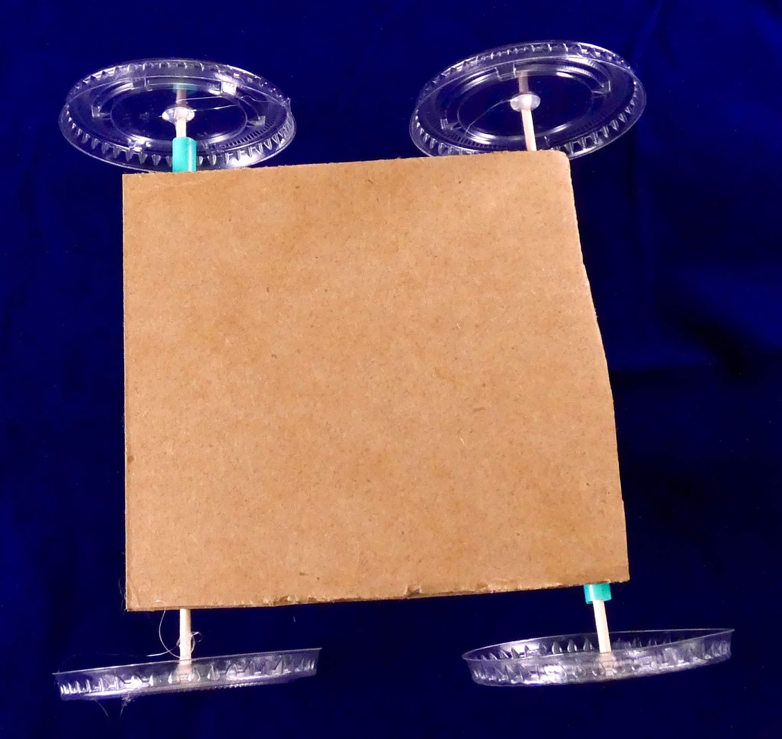Next, the discovered that the wheel axel had to rotate. There were several ways to do this but one was using a binder clip and another a straw.