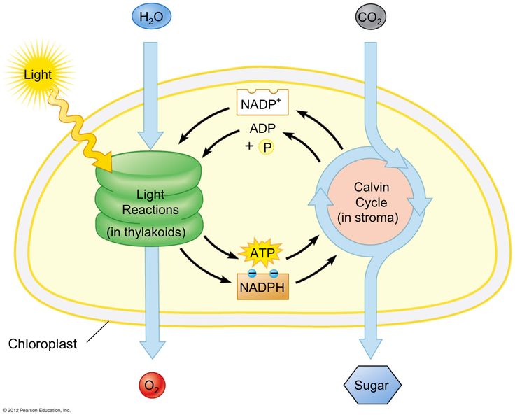 - Absorbed light energy is used to convert carbon dioxide (from the air) and water (from the soil) into a sugar called glucose