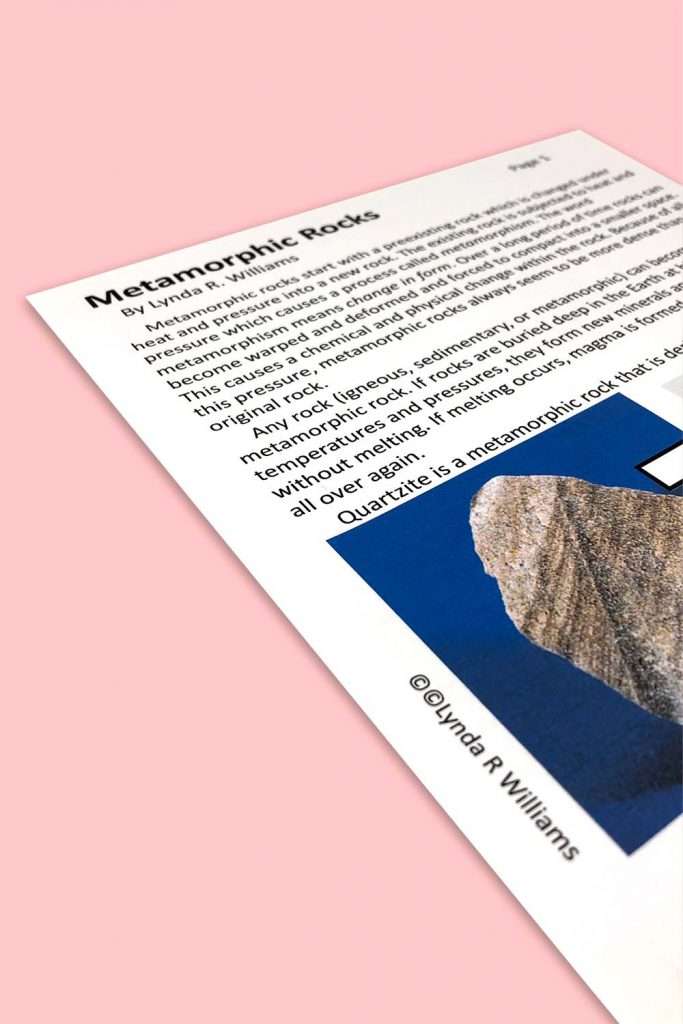The complete unit includes multiple nonfiction text passages on the rock cycle, response pages with text-dependent questions, hands-on labs, follow-up pages, interactive notebook folds and flaps, PowerPoint slideshows on metamorphic, igneous, and sedimentary rocks, QR code research, and a sorting activity!
