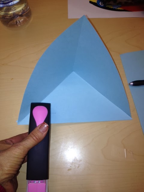 I start with a square. Then I cut the square from one corner to the center. Fold as in the photo. This is one of four sections of the triarama.