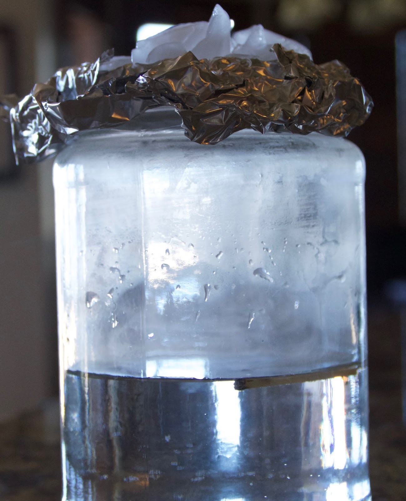Loosely seal the jar with the foil, pushing the foil into the jar slightly to make room for the ice cubes on top. - Place the ice cubes in the indentation in the foil
