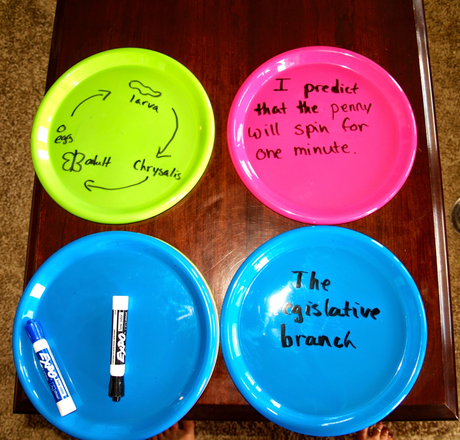 Want individual write and wipe board for your students but hesitate to spend your money that way?  Hard plastic plates from your local dollar store make great Write and Wipe Boards.  I bought mine four in a pack and was able to get a class set for 7 dollars!